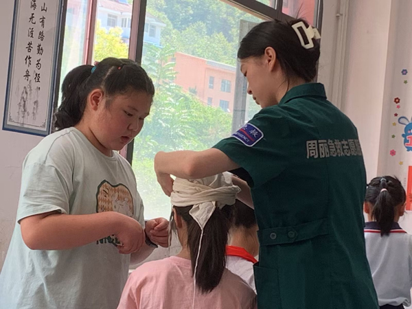 志愿者教学生们急救包扎知识