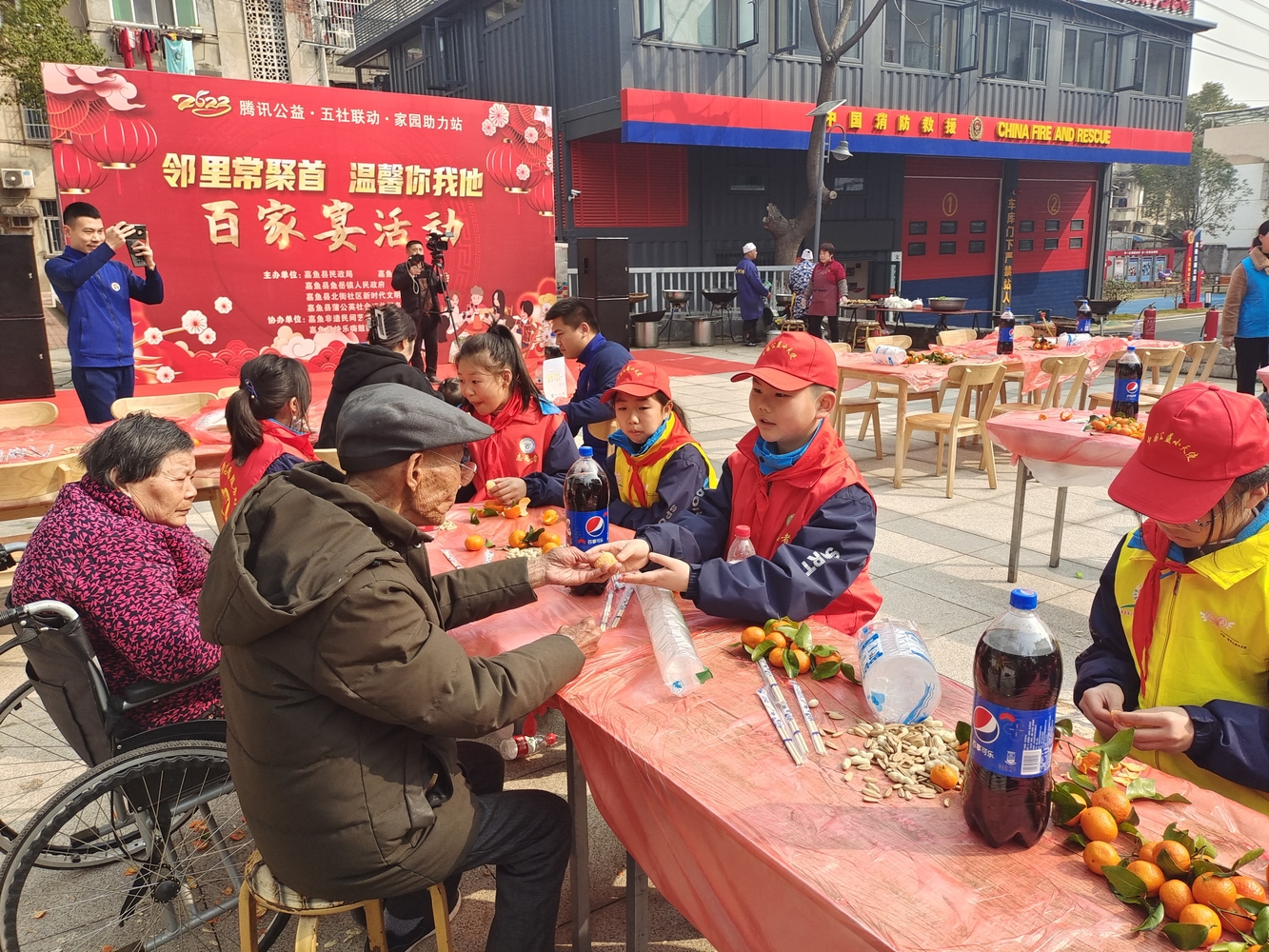 活动当天,20余名小学生身穿志愿服,走进北街社区文庙山小区,敲开60余户的家庭大门,向邻居说明来意,一家一家的募集爱心大米,并借此邀请了200余户居民参加社区百家宴。孩子们收集起来的“百家米”为社区举办“百家宴”提供了最有意义的食材。活动中,小小志愿者们还为老人捶背,传承孝德。活动当天还通过抖音直播的形式向全社会宣传此次活动,有3000余人关注直播,有500余人点赞,同时获得了云上嘉鱼、湖北日报等广泛关注和报道,受到社会的广泛关注。