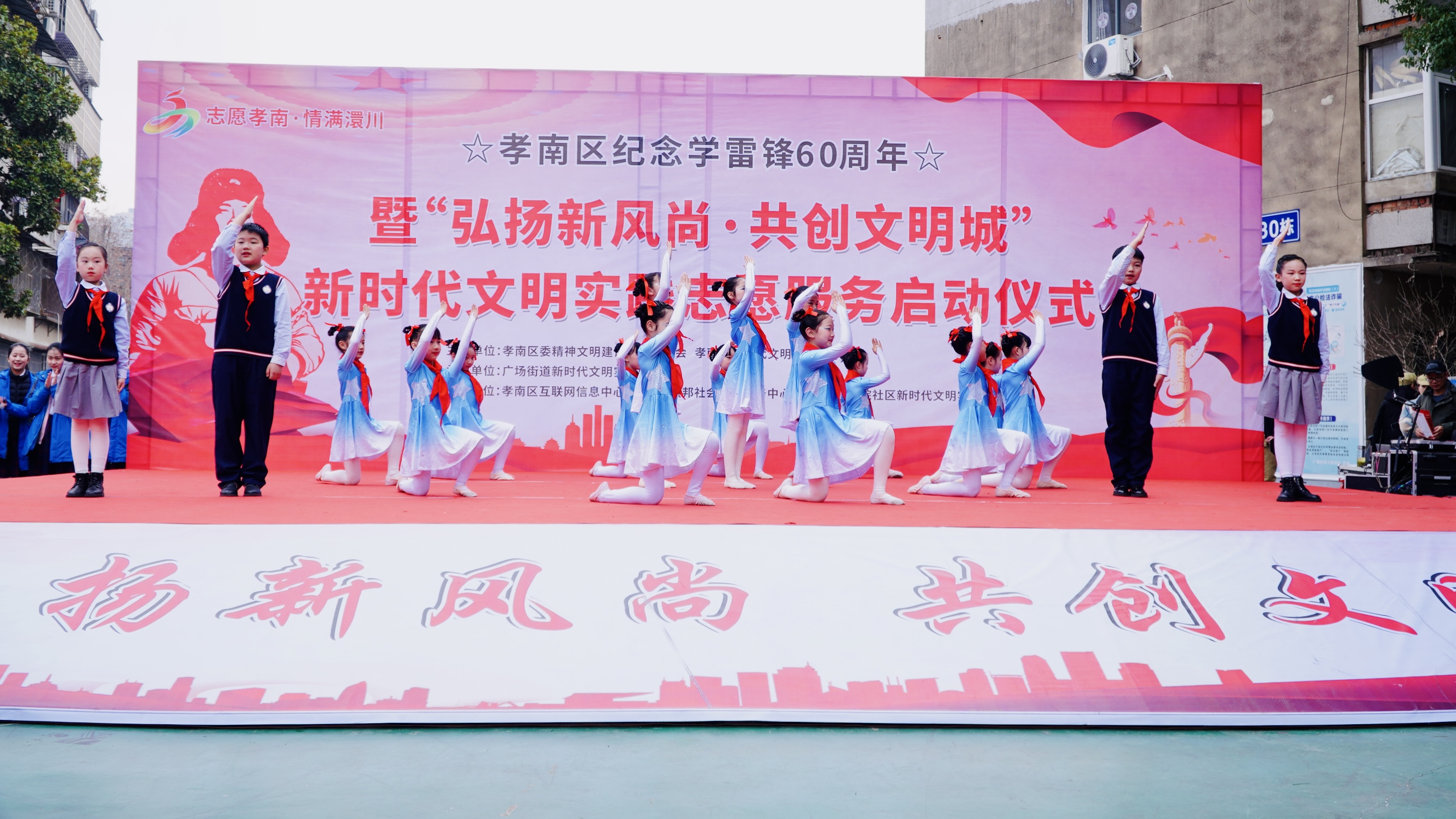 学校社区联动。3月3日上午,广场街道开展纪念学雷锋60周年暨“弘扬新风尚·共创文明城”文明实践活动,并组织启动仪式。在启动仪式上,孝感市实验小学教育集团的队员表演朗诵、舞蹈《学习雷锋好榜样》,向雷锋致敬,传承雷锋精神!