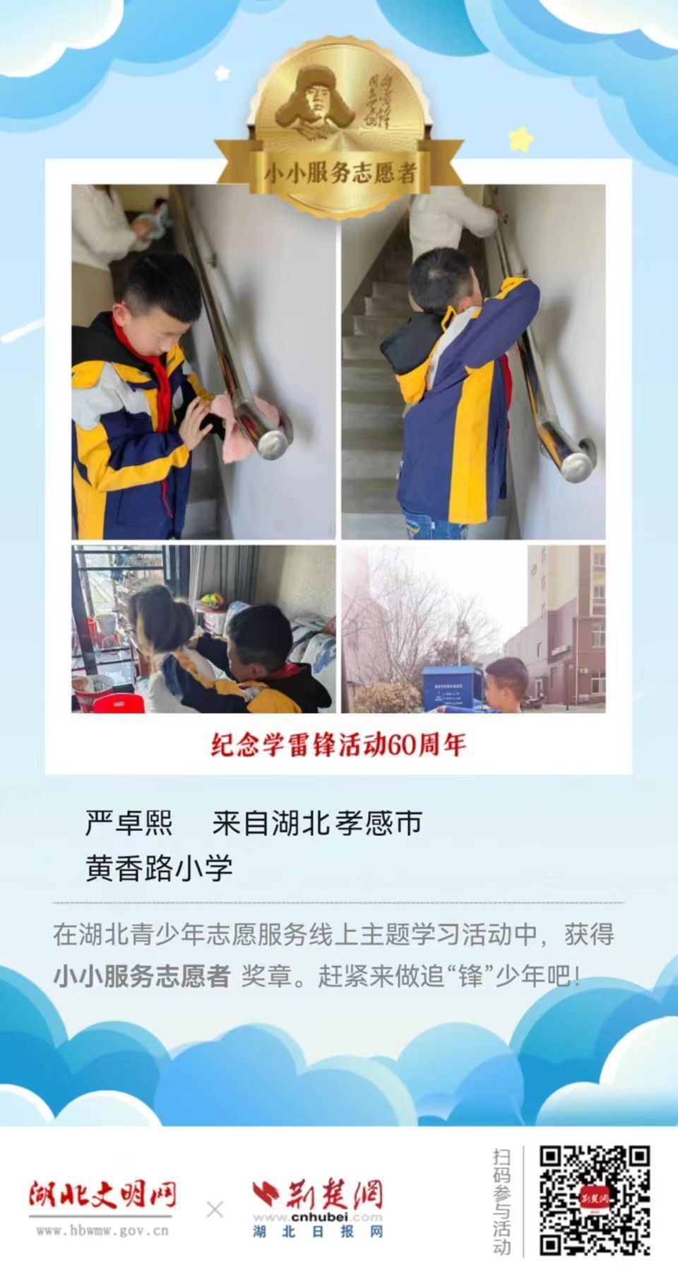 孝南区黄香路小学小志愿者们大力弘扬志愿服务精神,提高创新意识,拓宽服务渠道,努力践行社会主义核心价值观,让文明之花处处盛开。