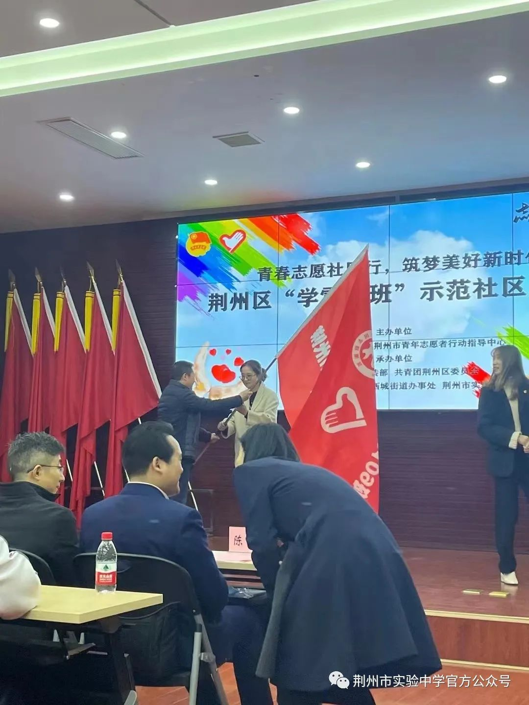 2021年12月5日,荆州区首个“学雷锋班”落户荆州市实验中学,在三义街社区,实验中学七(9)班作为荆州区首个“学雷锋班”参加了授旗仪式。