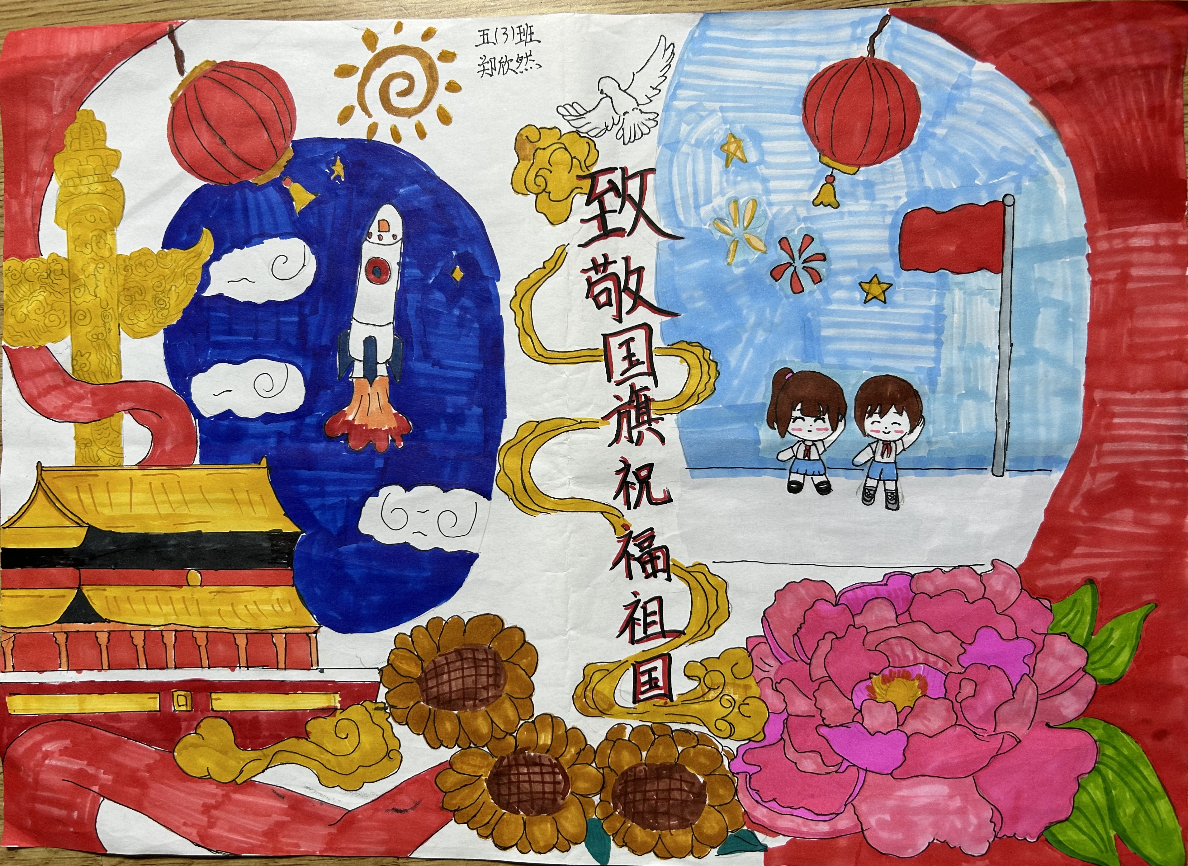 国旗飘扬中国红,红灯挂起庆国庆,祝福祖国繁荣和谐,国泰昌盛。(荆门市沙洋县实验小学郑欣然)