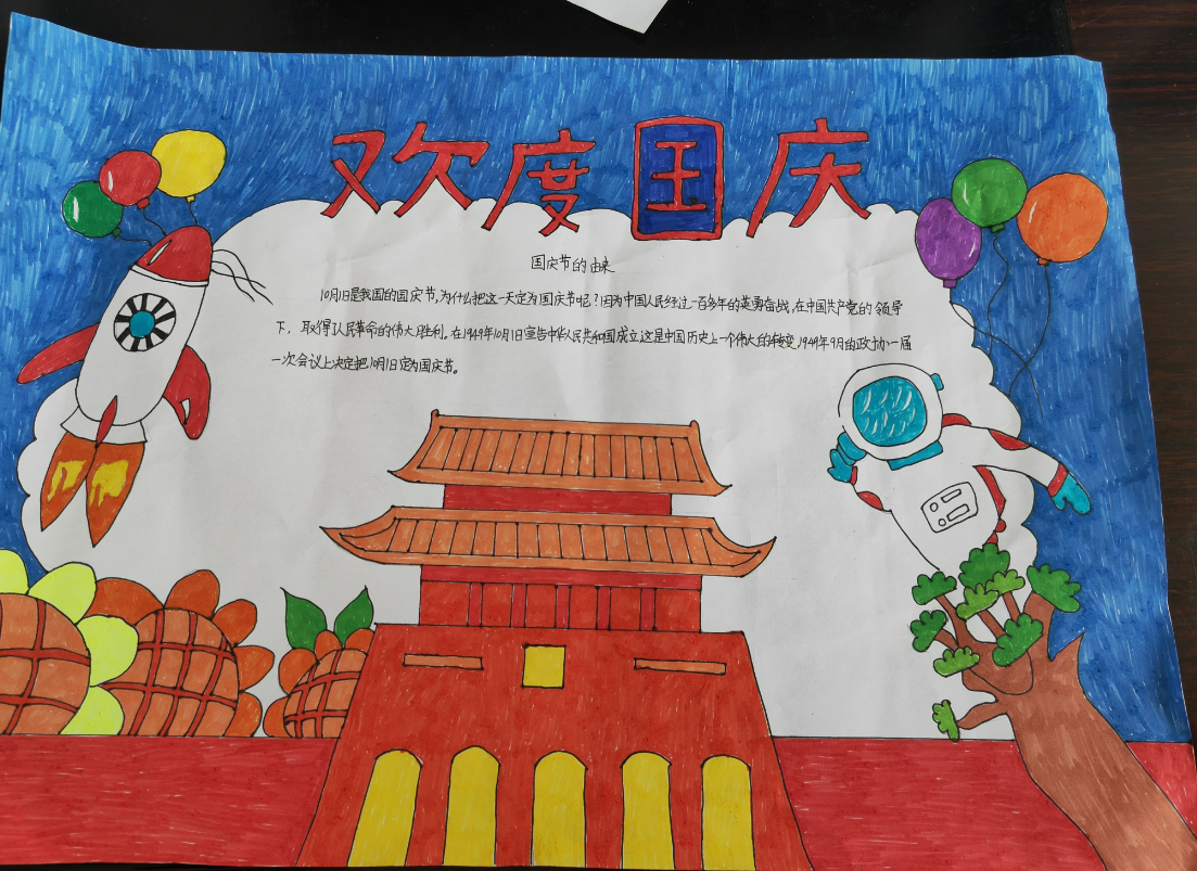 这幅绘画旨在激发人们对祖国的热爱之情,激励人们为祖国的繁荣和进步做出贡献。我希望这幅绘画能够在国庆节期间广泛展示,让更多的人都能够感受到祖国的伟大和美丽。(来凤县翔凤镇万家塘小学 王昱涵)
