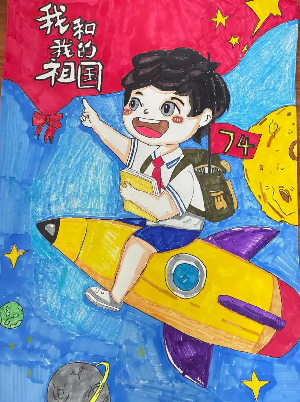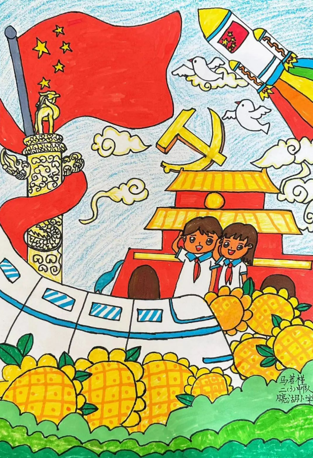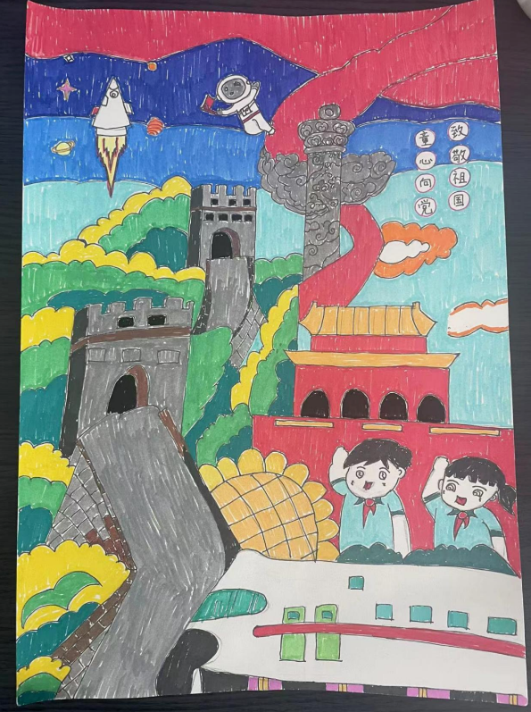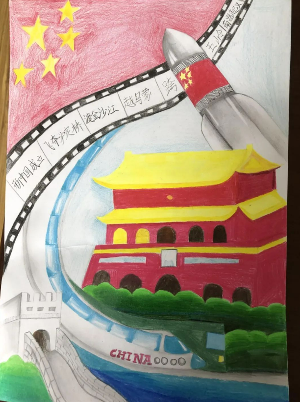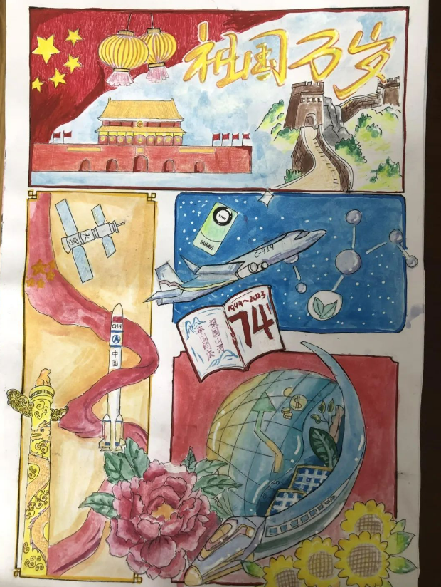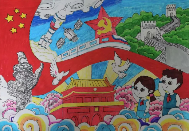 五星红旗、天安门、长城,表达了我对祖国的热爱和祝福。近些年,我们国家各个领域的的科技成果—卫星、火箭、飞机、高铁等,取得了举世瞩目的成就,显示了我们中华民族的崛起和复兴。在祖国日益强大的今天,在祖国母亲的庇佑之下,作为青少年的一代,我们要像向日葵一样,一心向党,好好学习,为祖国未来的建设而努力奋斗。