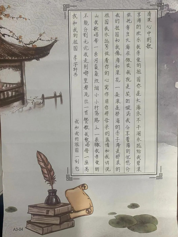 《清波心中的歌》这篇作品,用真挚的语言和文字,写出了我对祖国的热爱。目光所至皆为华夏,五星闪耀皆为信仰。我们生在红旗下,长在春风里,人民有信仰,民族有希望,国家有力量。苟利国家生死以,岂因祸福避趋之。诸君可见,时代的接力棒在我们手中,吾辈将续写里十里长安四海清平,春风依旧繁华如斯的新篇章。