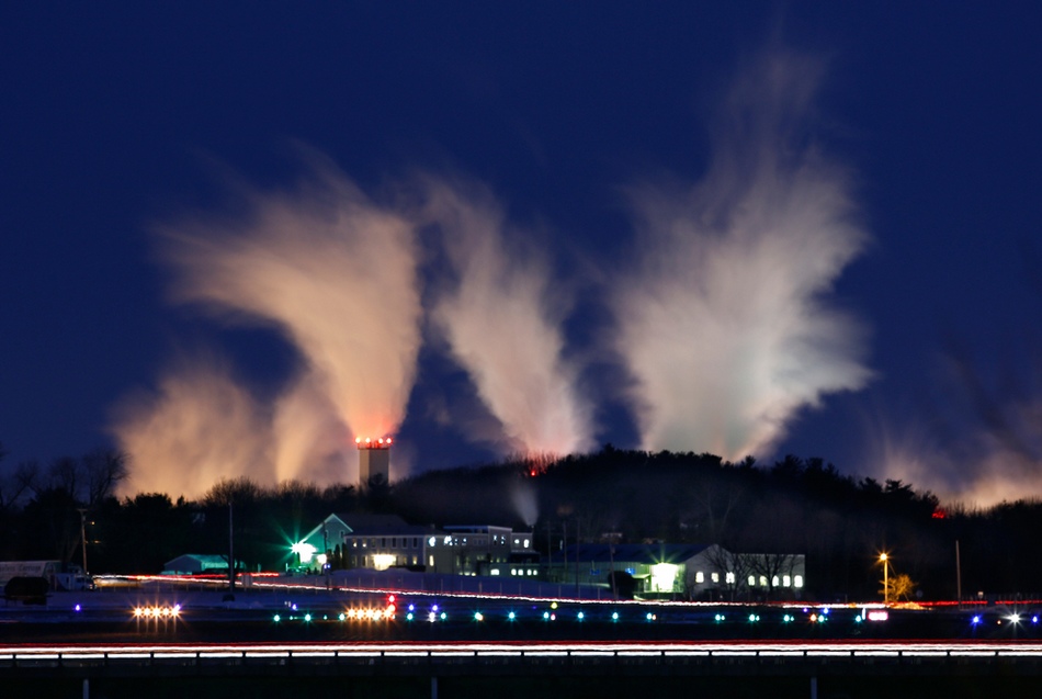 2013年1月24日,美国缅因州韦斯特布鲁克市造纸厂排出的水蒸气在-21℃的严寒中冒出巨大的白烟,渐渐消散在黎明前的夜空中。