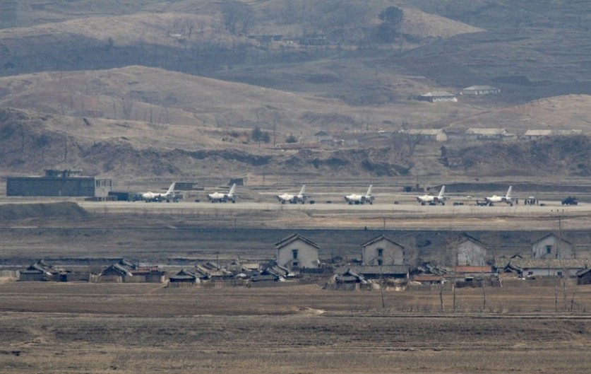 当地时间4月9日,朝鲜新义州空军机场停靠的H-5轰炸机。该机场位于中朝边境鸭绿江边,中国丹东市的对面。据悉,轰-5(H-5或B-5)是中国哈尔滨飞机公司参照苏联的伊尔-28轰炸机改进设计并试制生产的一种亚音速轻型轰炸机。