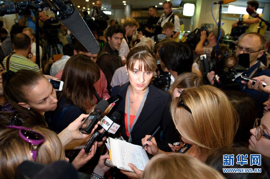 7月12日,莫斯科谢列梅捷沃机场新闻官安娜(中)在机场F航站楼接受记者采访。莫斯科谢列梅捷沃机场新闻处12日证实,滞留在该机场中转区的斯诺登将于当天与俄罗斯和国际人权组织代表以及知名律师会面。新华社记者姜克红摄
