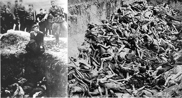 “最后一名犹太人”。照片来自党卫军士兵的私人相册,照片背后显示“最后一名犹太人”,照片里显示1941年在乌克兰文尼察,一名党卫军正准备向跪在满是尸体的坑边的一名犹太人开枪。大约有28000名犹太人在文尼察和周边被屠杀。