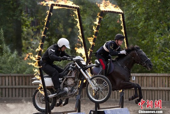 当地时间2012年9月12日,英国伦敦,英国官兵在海德公园进行阅兵和武器训练,为参加英军锦标赛做准备,他们分别骑车和骑马钻火圈。