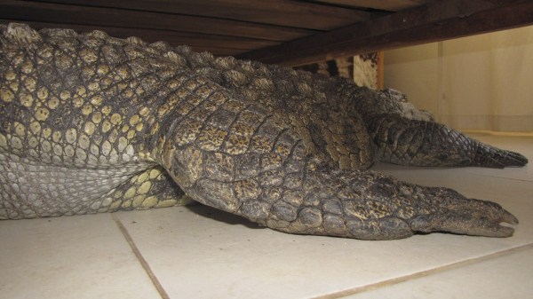 2013年9月17日报道,一头体长8英尺的鳄鱼溜进津巴布韦男子Guy Whittall的房间,整个晚上都静静地趴在他的床底下,第二天早上,Guy甚至还坐在床边打理事情,没有察觉到一头150公斤的大鳄鱼就在他的脚边。