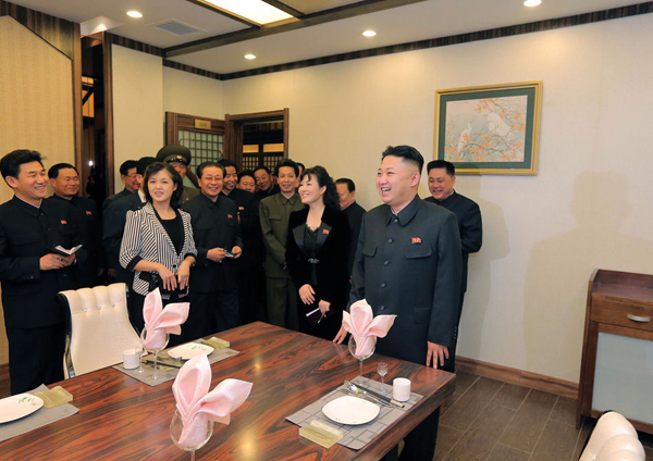 2013年4月29日提供的这张照片显示,平壤,金正恩夫妇参观“海棠花”健康中心。图为李雪主身后张成泽正在笑。(资料图)