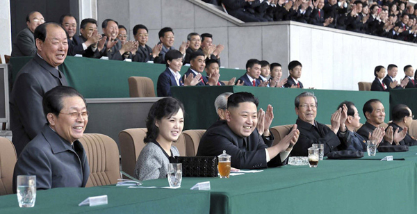 2013年4月29日,张成泽陪同金正恩夫妇视察了羊角岛足球场,并在金日成体育场观看了万景台奖运动会甲级男子足球赛。(资料图)