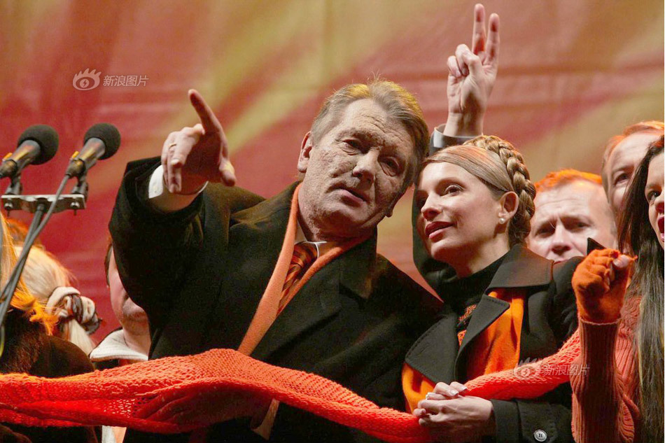 “橙色革命”最终获得胜利,尤先科以52%的选票当选总统。作为反对派阵营领袖的季莫申科也在2005年1月24日被任命为总理。图为同年12月16日,在基辅独立广场参加庆祝集会的季莫申科和尤先科。 供图:CFP