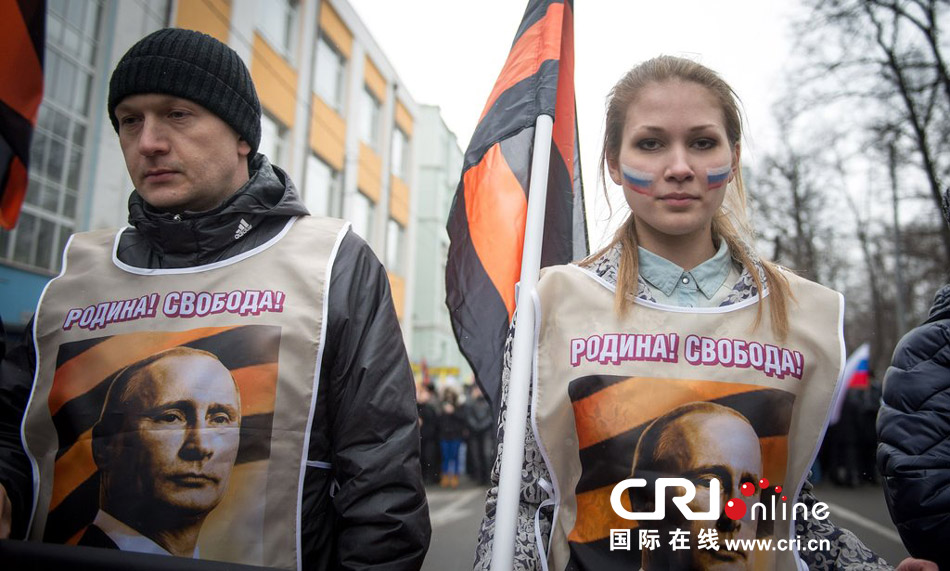 当地时间2014年3月2日,俄罗斯莫斯科,俄民众举行大规模集会,声援在克里米亚的乌克兰人及俄语民众,反对乌克兰新政府,对普京出兵乌克兰表示支持。图片来源:DMITRY SEREBRYAKOV/CFP