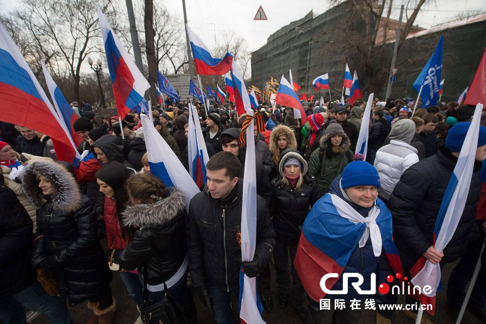 当地时间2014年3月2日,俄罗斯莫斯科,俄民众举行大规模集会,声援在克里米亚的乌克兰人及俄语民众,反对乌克兰新政府,对普京出兵乌克兰表示支持。图片来源:DMITRY SEREBRYAKOV/CFP