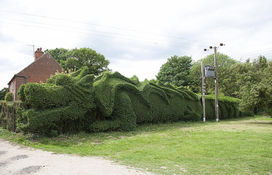 当地时间2014年5月21日,英国诺福克郡,一名园丁花了十年的时间,将他的灌木丛修剪成一条100英尺长的巨龙。这名园丁叫John Brooker,除了喷火的鼻子和尖尖的牙齿,他还给这条巨龙雕了一对翅膀和六双脚。为了追求细节上的精益求精,John总共花了将近10年的时间才完成这件作品。这条巨龙就在他家的花园旁边,常常害附近的路人吓一跳。