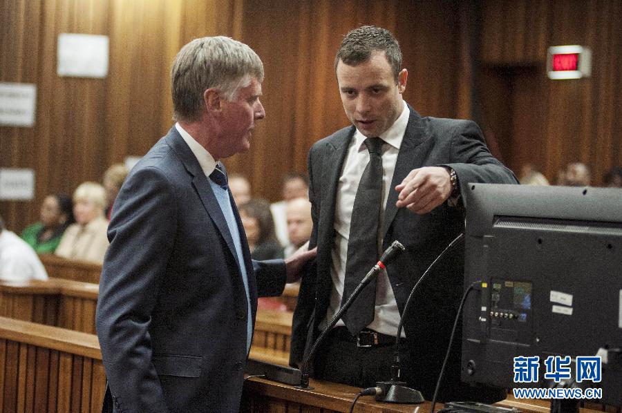 6月30日,奥斯卡·皮斯托瑞斯(右)与他的律师在庭审中交谈。当日,经过长达一个月的精神鉴定,“刀锋战士”奥斯卡·皮斯托瑞斯被认定神智正常,这意味着重新站上法庭的这名南非田径明星将面临谋杀女友的审判。新华社/法新