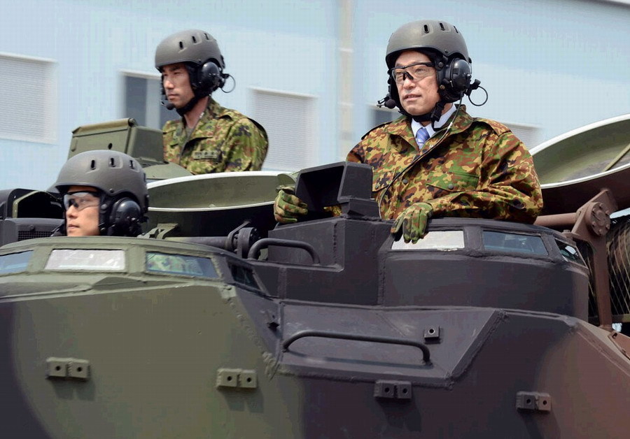 资料图:据日本《产经新闻》4月16日报道,日本防卫省16日在茨城县陆上自卫队霞浦驻地向媒体展示了从美军购买的“AAV7”水陆两栖战车。日本防卫相小野寺五典同日视察了霞浦驻地,并试乘“AAV7”战车。