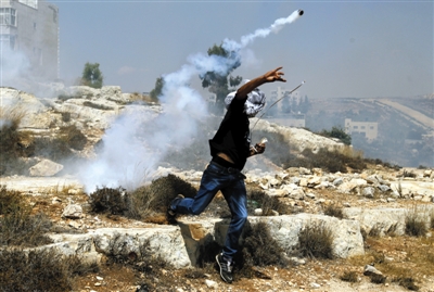 2日,巴勒斯坦约旦河西岸,一名巴勒斯坦人将以色列军队发射的催泪瓦斯弹扔回去。