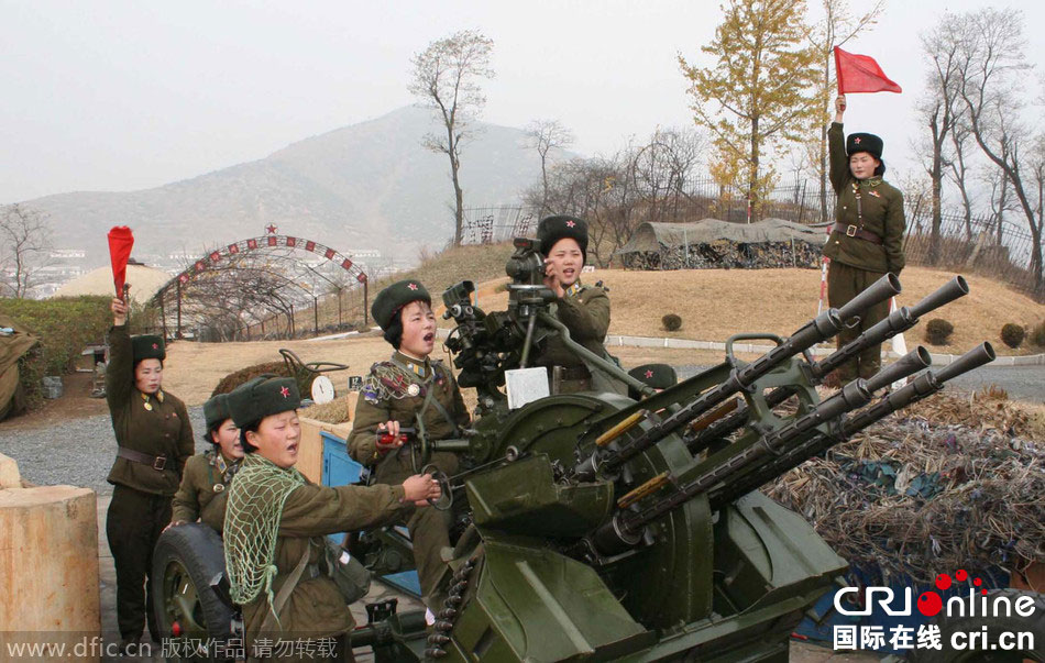 当地时间2014年10月10日,据韩联社报道,朝鲜利用14.5毫米高射机枪向韩国团体对朝放飞、载有反朝传单的气球发射开火。韩方称有数枚子弹落入韩国境内,韩军随后利用K-6机关枪回射40多发。图为朝鲜女兵正使用14.5毫米高射机枪训练。 图片来源:东方IC
