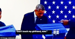 晨报综合消息 据英《每日邮报》报道,美国总统奥巴马当地时间20日去芝加哥参加伊利诺伊州中期选举投票。在投票站,在他隔壁投票的是一名女选民库珀。一旁等待的库珀的未婚夫迈克·琼斯走到两人面前,“警告”奥巴马说:“不要碰我女朋友(如图1)。”