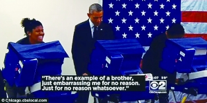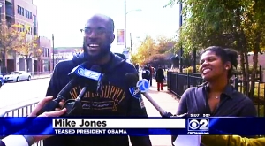 奥巴马开玩笑说,琼斯“是一个无缘无故会让你感到尴尬的哥们”(如图2)。这名叫艾阿·库珀的黑人女子对奥巴马抱歉地说:“这真的不是我故意策划的。”奥巴马不禁对女子开起了玩笑:“这儿刚才有个老兄在骚扰你,而且还没有任何原因。现在你可以回家这么告诉你的朋友们。对了,你男朋友叫什么来着?”“迈克。”库珀说。