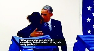 投完票后,奥巴马来到库珀身边,亲吻并拥抱了她(如图3)。奥巴马拿她男友琼斯开玩笑说:“现在,他真的要吃醋了。”琼斯在接受采访时表示,因为当时现场气氛太严肃,所有人都只是在拍照或者投票,所以他才想着说点逗乐的事让大家欢乐下(如图4)。