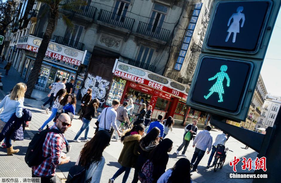 当地时间2016年3月8日,西班牙巴伦西亚,民众穿越“女性”信号灯街道。据悉,该设置为提倡性别平等。