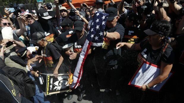 当日,防暴警察和武装警察在街道上部署,部分街道被封锁。当有示威者试图烧毁一面美国国旗时,警方与示威人群的紧张关系被激化。警方冲进去将火扑灭,并下令驱散人群,但有示威者予以拒绝。