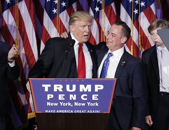 近日,美国当选总统唐纳德·特朗普完成了最早两项重要人事任命:共和党全国委员会主席普里伯斯任白宫办公厅主任,此前担任竞选团队负责人的班农任首席策略师和高级顾问。