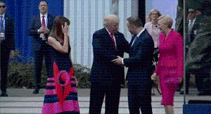6日,特朗普夫妇和波兰总统安杰伊?杜达夫妇在波兰首都华沙出席一场活动,四人站成一排向人群挥手致意。随后,特朗普和杜达握手。站在杜达身旁的妻子阿加塔主动伸出手,特朗普误以为阿加塔要同自己握手,连忙伸手。就在这一瞬间,尴尬发生了。阿加塔径直走向特朗普妻子梅拉尼娅,留下特朗普一脸黑线。