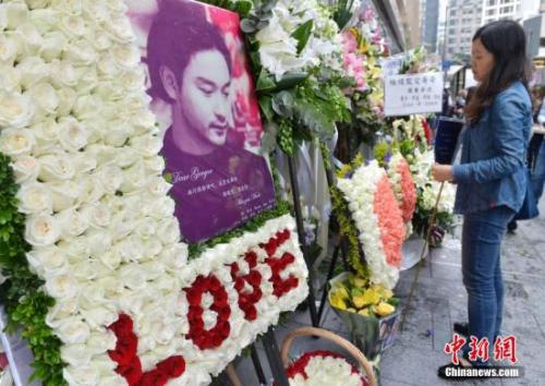 一名女“粉丝”向“哥哥”张国荣遗像摆放鲜花后悼念留泪。中新社发 邓庆乐 摄