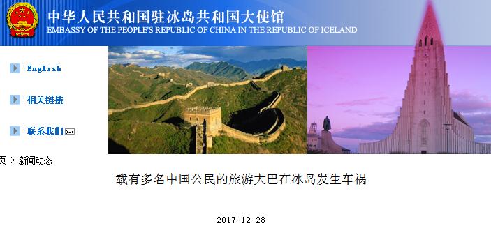 中国驻冰岛大使馆12月28日发布消息称:12月27日上午11时左右,一辆载有40余名中国公民的旅游大巴在冰岛南部维克镇附近(距首都约250公里)发生倾翻事故。据冰方通报,已知有1名中国公民死亡,多名中国公民不同程度受伤,其中10余名伤势较重者已被送往位于冰岛首都雷克雅未克的冰岛国家医院进行救治。