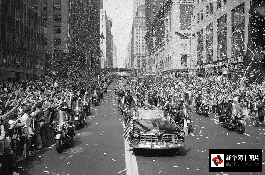 1969年8月13日,纽约第42号街。人们为阿波罗11号宇航员欢呼。坐在车辆头排的三位宇航员由左至右为:奥尔德林、柯林斯和阿姆斯特朗。当日,宇航员们离开了隔离区并接受美国民众的欢呼,同一天在纽约、芝加哥和洛杉矶都进行了为他们庆祝的游行。