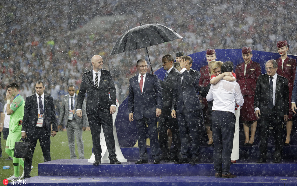 其中既包括FIFA主席因凡蒂诺和法国总统马克龙,也包括克罗地亚女总统基塔罗维奇。马克龙的身上还额外淋着从普京雨伞上漏下来的雨。