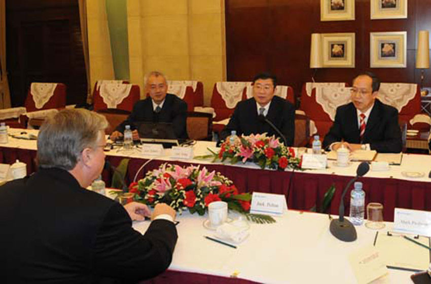 沈飞公司总经理罗阳(中)在沈阳会晤了塞斯纳公司总裁杰克·皮尔顿。