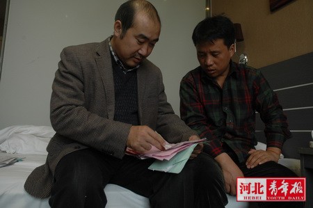 潘向民(右)拿着一些乱罚款的票据向老师王金伍求教,怎样更好地进行交通维权