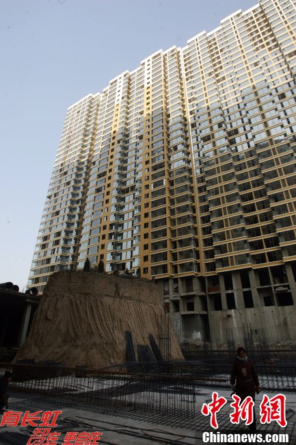 [“钉子坟”现太原一小区 村委会称已付百万元迁坟费]12月6日,在太原市长风街龙保村一在建工地,一座近10米高、占地10平方米左右的孤坟耸立在施工现场,如同在两侧高层住宅楼间打下一颗钉子。中新社发 张云 摄