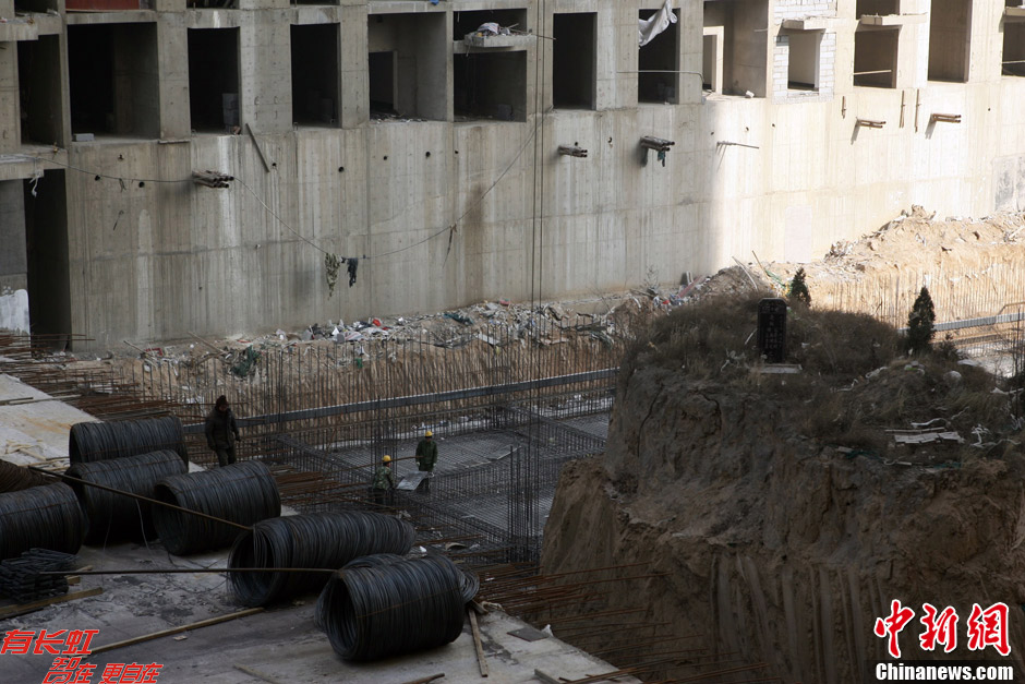 [“钉子坟”现太原一小区 村委会称已付百万元迁坟费]12月6日,在太原市长风街龙保村一在建工地,一座近10米高、占地10平方米左右的孤坟耸立在施工现场,如同在两侧高层住宅楼间打下一颗钉子。中新社发 张云 摄