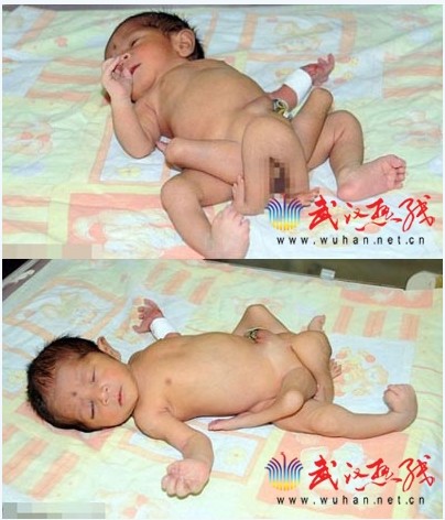 据国外媒体报道,巴基斯坦医生正在努力拯救一名患有罕见遗传病,拥有6条腿的新生儿。卡拉奇国家儿童健康研究所负责人贾马尔-拉 扎表示,这个1周大的男婴被认为是寄生双胞胎中的一个。他的连体婴是一个发育不健全的早产儿,这导致另一个孩子长出额外的腿。