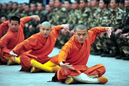 福建少林武僧与武警新兵战士“切磋”功夫(图)