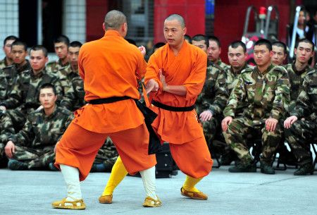 福建少林武僧与武警新兵战士“切磋”功夫(图)