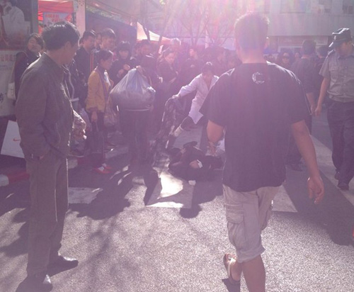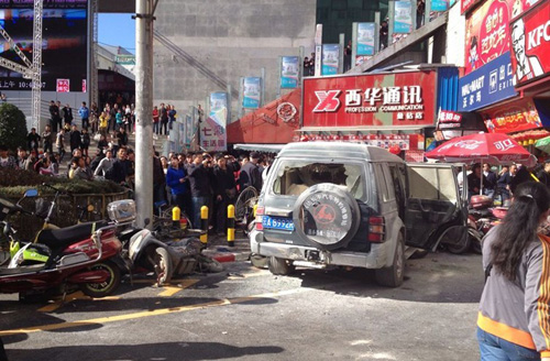 据现场目击者徐师傅表示,他当时正在大观商业城门口擦皮鞋,忽然听到很多人惊呼,一抬头,发现一辆越野车高速向商城门口冲来,沿途还撞开了一辆小轿车,并将一名路过的男子撞飞。随后越野车冲向商城门口的肯德基餐厅,将一名正在停放电动车的姑娘压在车下,姑娘右腿当场骨折,骨头都露了出来。