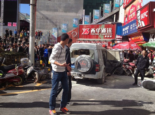 记者感到现场看到,大观商业城多个路口已实行交通管制,交警正引导过往车辆掉头绕行。在大观商业城正门和肯德基餐厅交汇处,数辆电动车被撞倒,有的被压在一辆车牌号为云AB992R的越野车下,四周还散落着几辆自行车。越野车内部已被烧得面目全非,侧车窗和后车窗玻璃被敲碎,现场聚集着大量围观的人群。数辆消防车和急救车在附近待命。