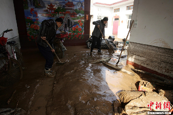 2月15日,山西省洪洞县曲亭水库灌溉输水洞洞顶发生垮塌事故,导致下游坝体出现管涌,坝体大面积塌陷,满蓄1900万立方米的水库正在向下游流进。距离水库下游的甘亭镇南羊獬村是受灾最严重的村庄之一。图为2月17日,村民正在清除淤泥。张云 摄