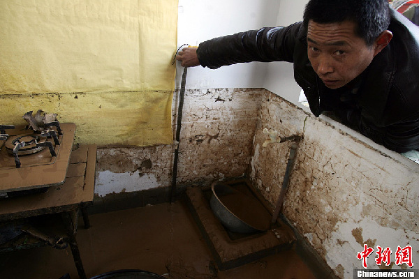 2月15日,山西省洪洞县曲亭水库灌溉输水洞洞顶发生垮塌事故,导致下游坝体出现管涌,坝体大面积塌陷,满蓄1900万立方米的水库正在向下游流进。距离水库下游的甘亭镇南羊獬村是受灾最严重的村庄之一。图为村民告诉记者,家中水深曾达78厘米。张云 摄