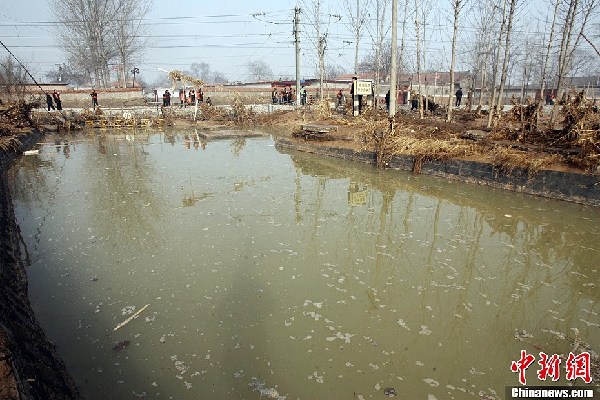 2月15日,山西省洪洞县曲亭水库灌溉输水洞洞顶发生垮塌事故,导致下游坝体出现管涌,坝体大面积塌陷,满蓄1900万立方米的水库正在向下游流进。距离水库下游的甘亭镇南羊獬村是受灾最严重的村庄之一。图为图为村前仍被大水阻拦。张云 摄