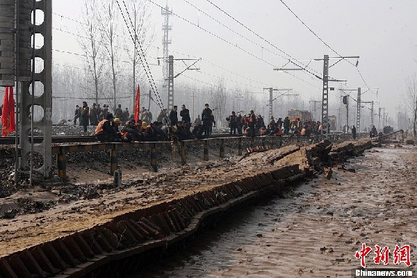 2月17日下午,被冲毁的1.4公里铁路在5000余名太铁工作人员的一天一夜抢修下,已于16点半恢复下行(北到南)线路通车,预计20点将恢复上行(南到北)通车。2月15日,山西省洪洞县曲亭水库灌溉输水洞洞顶发生垮塌事故,导致下游坝体出现管涌,坝体大面积塌陷,满蓄1900万立方米的水库向下游流进。图为铁路两旁的隔音墙也被冲毁。中新社发 张云 摄