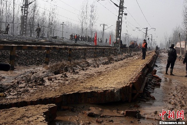 2月17日下午,被冲毁的1.4公里铁路在5000余名太铁工作人员的一天一夜抢修下,已于16点半恢复下行(北到南)线路通车,预计20点将恢复上行(南到北)通车。2月15日,山西省洪洞县曲亭水库灌溉输水洞洞顶发生垮塌事故,导致下游坝体出现管涌,坝体大面积塌陷,满蓄1900万立方米的水库向下游流进。图为铁路两旁的隔音墙也被冲毁。中新社发 张云 摄